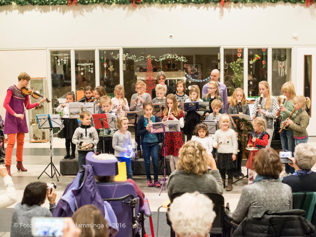 Het was een groot muzikaal feest op het dorpsplein in het Zonnehuis op vrijdag 16 december. Een prachtig versierde zaal, opgetogen musici, een groot publiek van rond de 100 mensen en muzikaal samenspel. De bijna 30 leerlingen van blokfluitdocente Marianne Heeres, viooldocente Oktje Lambermont en pianodocente Maaike van den Hoek speelden een divers repertoire. Van Bach tot Anouk en natuurlijk talloze bekende en minder bekende kerstliederen.